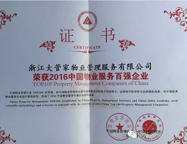 圖:2016中國物業(yè)服務(wù)百強(qiáng)企業(yè)證書